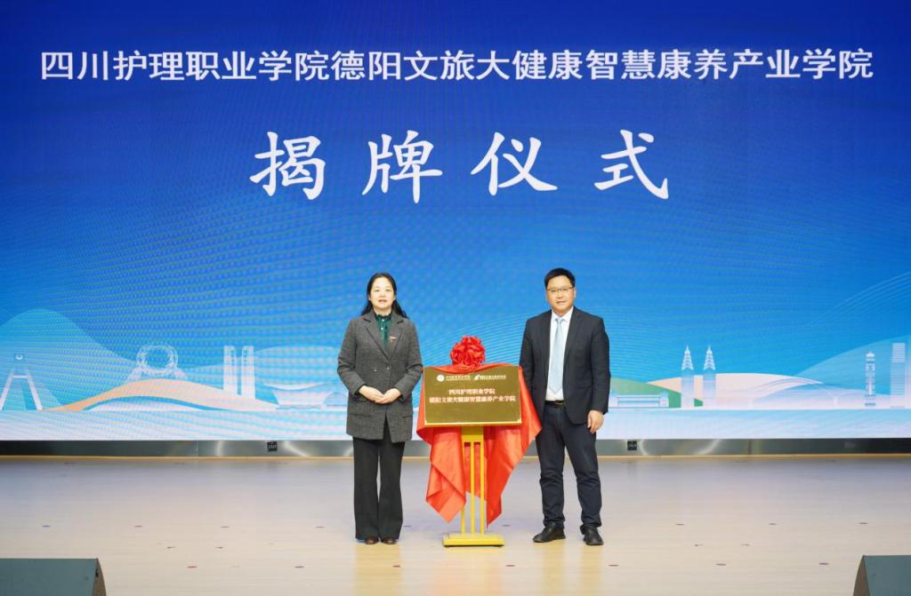 会上,揭牌成立了西部首个智慧康养产业学院——四川护理职业学院德阳文旅大健康智慧康养产业学院,举行了共同体、联合体和联盟2025年度科普作品颁奖仪式和科研项目申报指南发布仪式,并为现代智能大健康服务产教融合共同体副理事长单位、学院博音听力和美丽一生产教融合实训基地授牌。