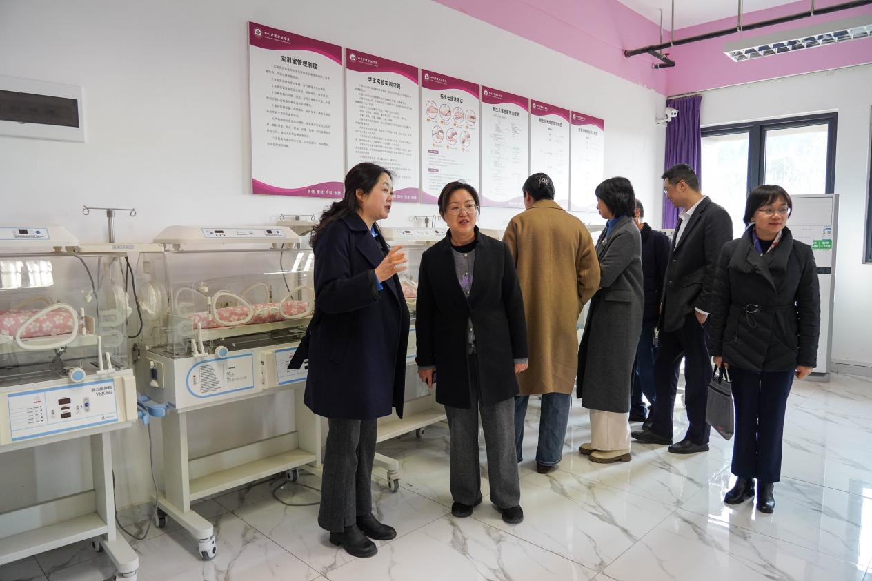 调研组一行考察了我校护理实训大楼,先后查看了虚拟仿真实训中心、母婴护理技能体验区、老年照护体验区等场地,认真听取了智慧护理学院负责人的详细汇报,深入了解了实训大楼在仿真幼儿模型、急救设备、智慧托育软硬件等赛事所需设施的配备情况,以及场地布局、安全保障、功能适配性等情况。