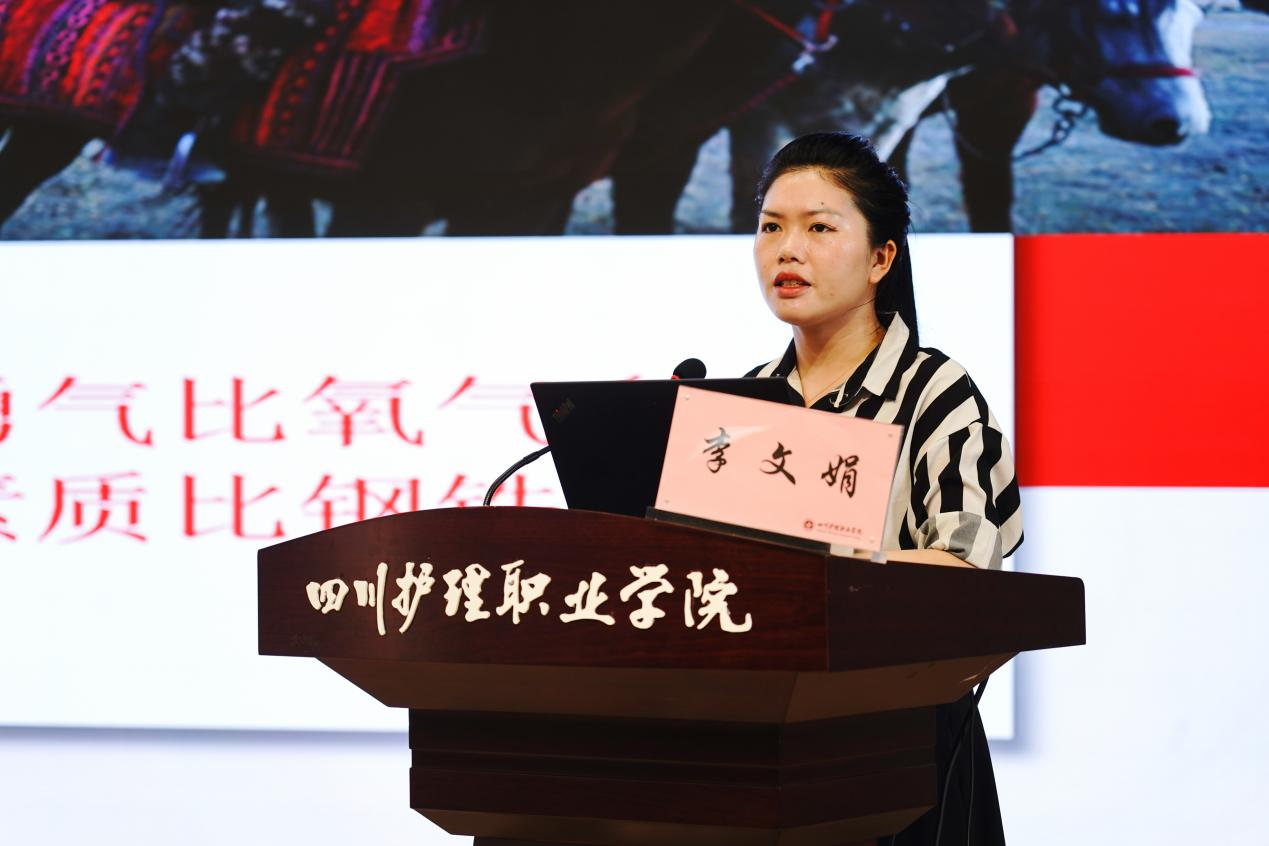 李文娟以“青春向党 不负人民”为主题,从“不忘初心、砥砺奋进”、“脚踏实地、行稳致远”、“前程似锦、未来可期”三个方面,声情并茂地分享了她作为护理专业学生,立志勤奋学习,逐步树立大爱无疆、报效祖国理念的学习历程。重点讲述了自己毕业后积极响应党和国家号召,自愿扎根新疆、服务新疆的成长奋进之路。她深情讲述了8年来,她坚定理想信念,用实际行动践行家国情怀的心路历程。作为四川本土成长毕业的护理学子成长为新疆克州阿克陶县布伦口乡党委书记和新疆克州商务局副局长,她克服了常人难以想象的语言、气候、环境、交通、工作、生活等带来的不适与挑战,带领乡亲们常年坚守祖国边疆——新疆克州阿克陶县布伦口乡等4个乡镇,在帕米尔高原上攻坚克难、砥砺奋进、励精图治、勇毅前行,攻克了一个又一个难题,取得了一项又一项突破,实现了一个又一个奋斗目标,新疆克州阿克陶县布伦口乡快速发展变化,她代表乡亲们曾三次受到习近平总书记亲切接见。她表示,将继续在以习近平同志为核心的党中央领导下,坚守初心,牢记使命,进一步践行感恩、奋进、大爱无疆的精神,一辈子守护新疆、奉献新疆。