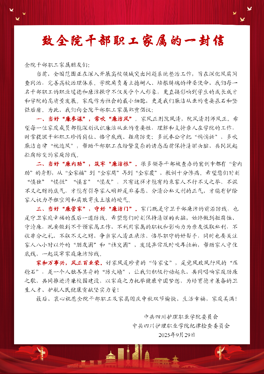 国庆中秋双节将至,在全国范围正在深入开展高校领域突出问题系统整治工作之际,在检验深入贯彻中央八项规定精神学习教育成效的重要节点,四川护理职业学院党委、纪委以家风建设为切入点,紧抓节日契机,以良好家风带动清廉作风,守好“小家”共筑学院“大家”。