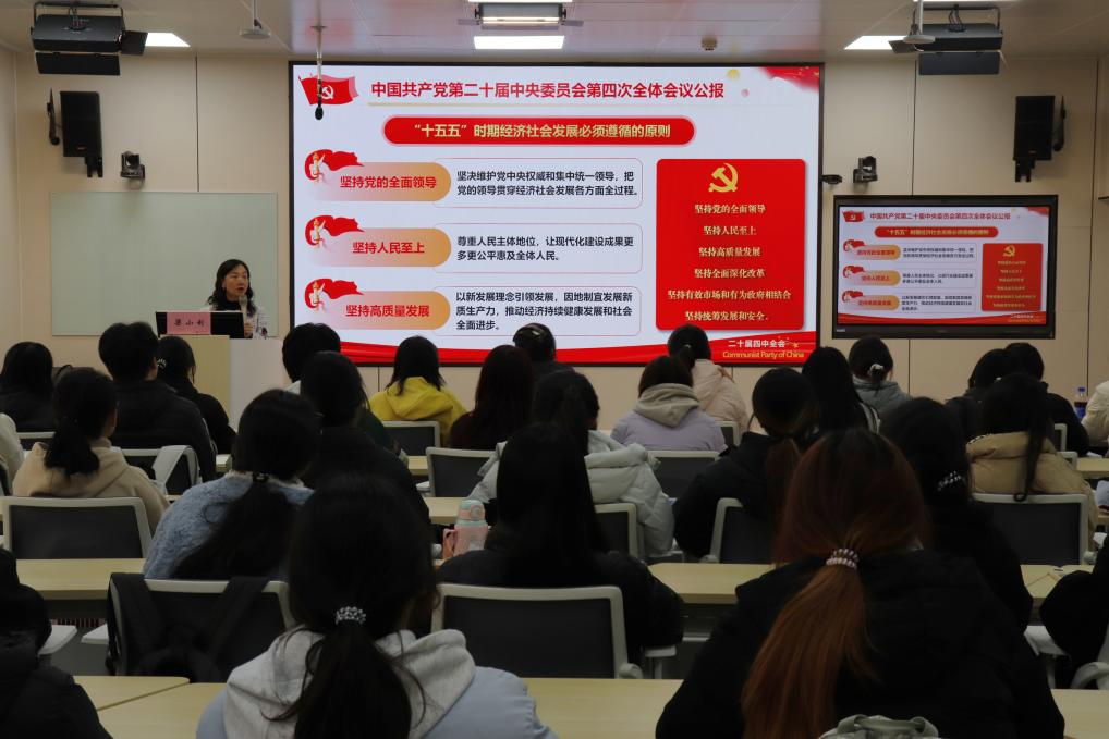 梁小利首先带领大家回顾了“十四五”时期的重大成就,随后,向同学们宣讲了党的二十届四中全会精神,展望了“十五五”的发展蓝图。她鼓励大家提高思想觉悟,遵循“坚持党的全面领导、坚持人民至上、坚持高质量发展”的原则,准确把握时代机遇,为个人长远发展奠定坚实基础。