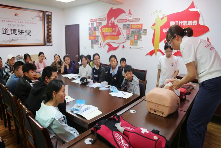 服务队在壤塘县设点,为当地群众送上家门口的“健康大礼包”。服务内容包括:免费测量血压,关注基础健康指标;开展急救知识与技能普及培训,增强自救互救能力;举办健康知识讲座,传播科学保健理念。队员们不仅提供专业的健康服务,更积极充当“推普员”,耐心用普通话与居民沟通,在健康咨询、急救教学、知识讲解中推广普通话的使用,帮助大家在获取健康知识的同时,提升运用国家通用语言文字的能力。