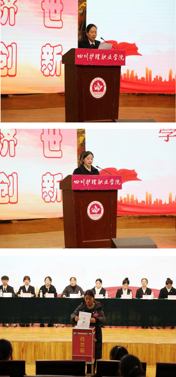 大会在庄严的国歌声中拉开帷幕。会议宣读了学院团委《关于同意药学院召开第四次学生代表大会的批复》,听取并审议通过《药学院第四届学生委员会工作报告》,大会表决通过了《四川护理职业学院药学院第五届学生会主席团选举办法》及《四川护理职业学院第四次学生代表大会监票人、计票人建议名单》。通过民主选举,学生曾清美、阳怡珊、朱茂桦当选药学院学生会第五届主席团成员。